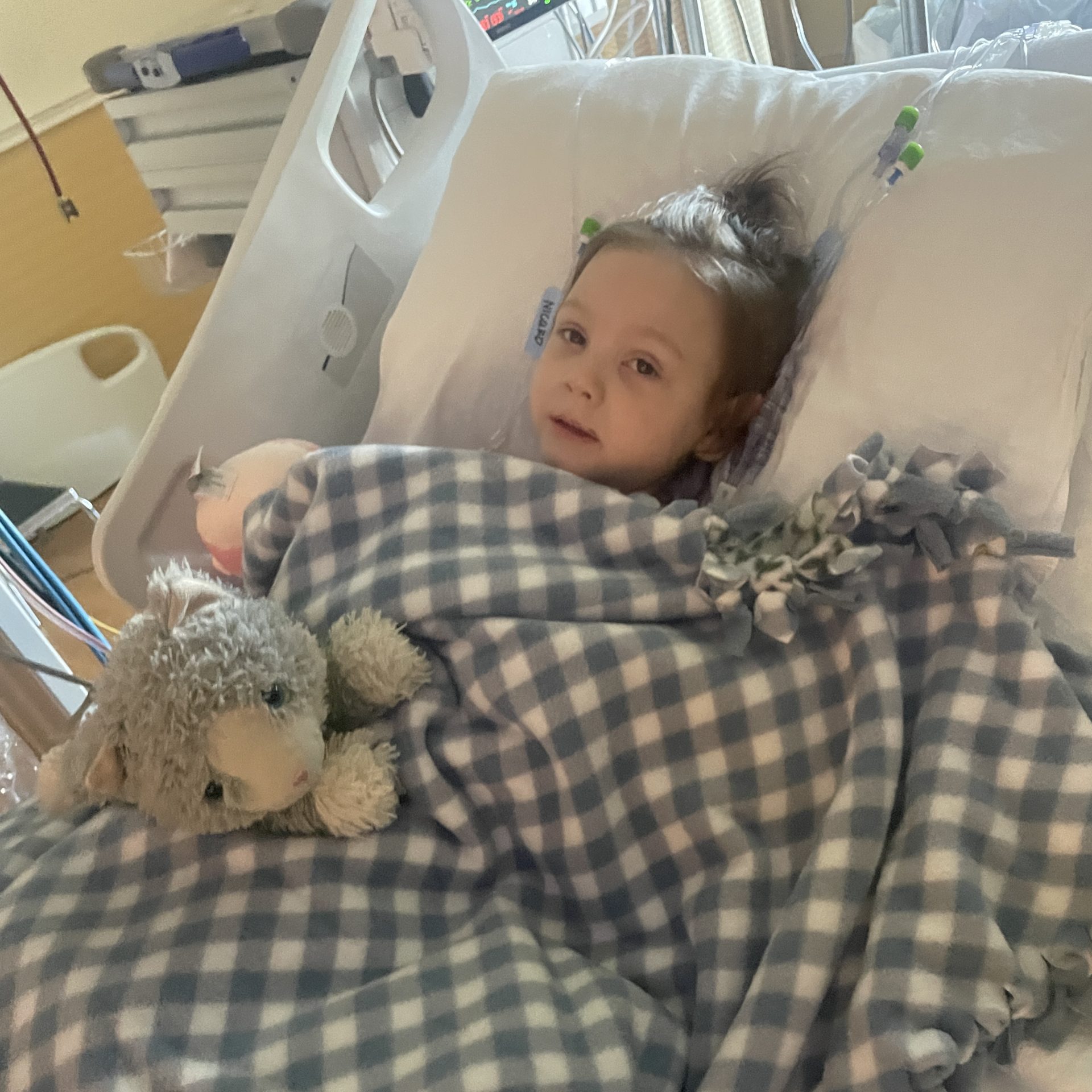 I had never heard of HUS prior to this, but in a very short timeframe I was educated and they requested we sign consent forms for her care. This was extremely overwhelming. Even though we trusted the medical care, some of the side effects and risks were too much to process. We initially were told Hattie would be intubated for the first few days of continuous dialysis, but there was a miscommunication and she was awake after surgery. This meant she would be awake, not able to get out of bed, eat or drink while she was receiving the dialysis.